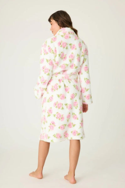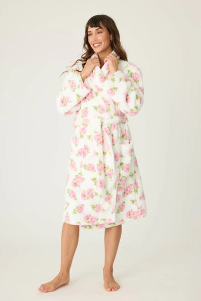 Stop and smell the cozy roses. Scattered blooms in soft pink add a vintage-inspired finish to this ultra-soft fleece robe, crafted for serious snuggle weather with a plush, nubby texture that feels like a hug. The relaxed wrap silhouette features roomy sleeves, pockets, and a self-tie belt for a sweet, easy fit.